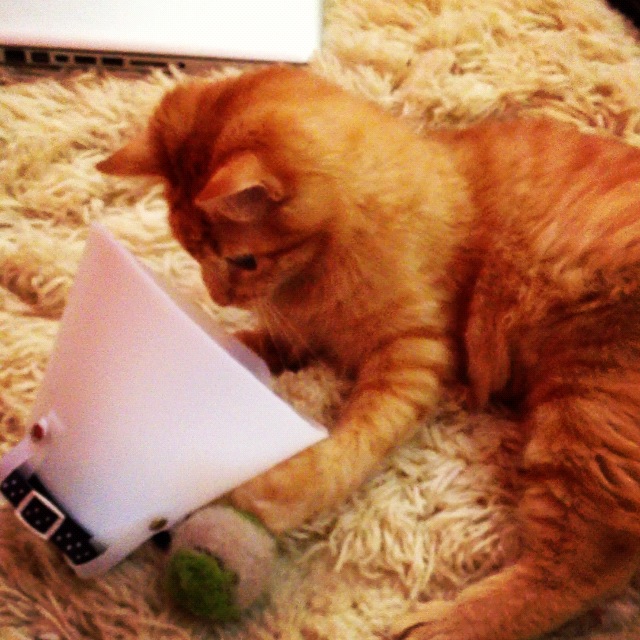 Leão brincando com o colar pós cirúrgico