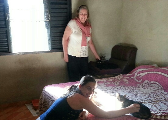 A casa é grande e tem tela nas janelas, com acesso à rua somente pela porta da sala, que permanece fechada e é aberta com atenção por causa dos outros gatos e dos três cachorros que são de pequeno porte, queridos e velhinhos.